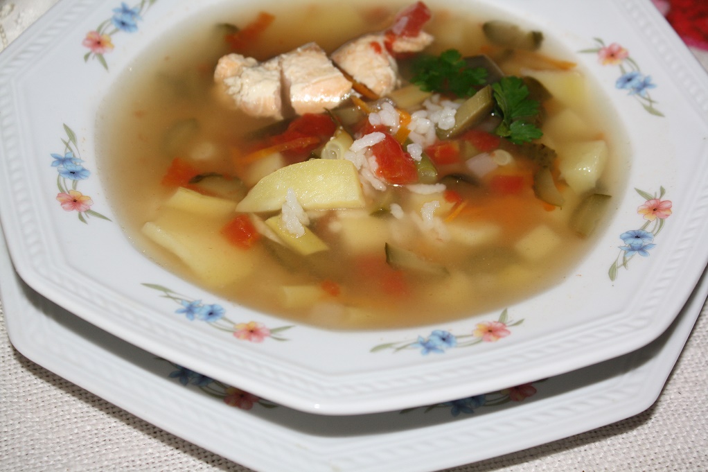 По 100 гр картофеля и маринованных огурцов, по 50 гр моркови, помидоров и репчатого лука, 2 столовые ложки риса, 200 гр отварного на пару филе красной рыбы, 0,8 л бульона (овощной, куриный или уха из красной рыбы), пряности по вкусу, при необходимости 100-150 мл огуречного рассола (в этом случае количество бульона необходимо уменьшить).