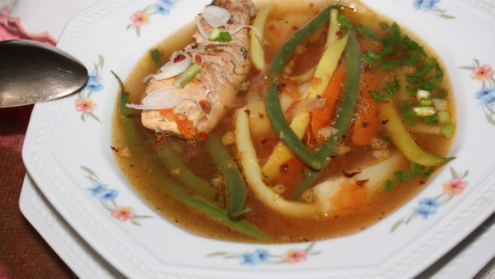 200 гр филе горбуши, 150 гр картофеля, по 50 гр моркови и репчатого лука, по 80 гр спаржевой фасоли и помидоров, 600 мл рыбного или овощного бульона, стебель зеленого лука, 20-30 гр топленого масла, по 1 чайной ложке растительного масла и красного винного уксуса соль, пряности по вкусу.