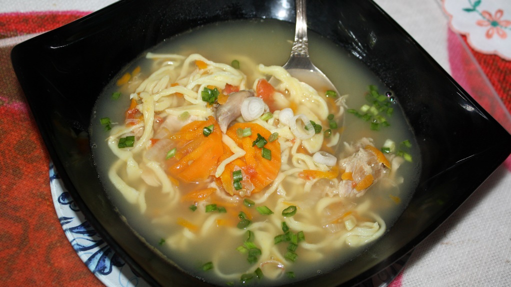По 25 гр моркови, репчатого лука, готовой домашней лапши, по 50 гр отварного мяса и свежих помидоров, стебель зеленого лука, соль, пряности по вкусу, 0,5 литра бульона из курицы.