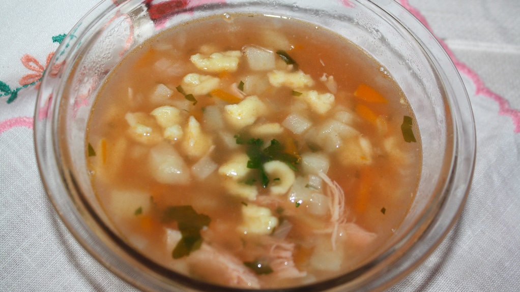 Охлажденное тесто для домашней лапши отщипывать небольшими кусочками и опускать в кипящий суп, варить при медленном кипении еще около 5-8 минут.