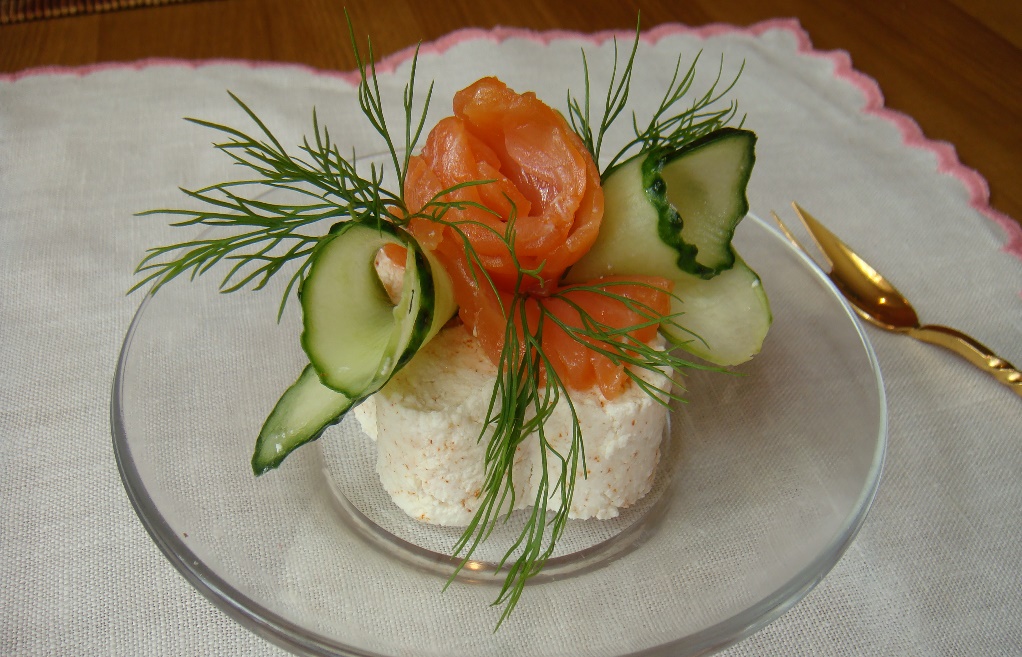 200 гр творога (лучше обезжиренного), 0,5 чайной ложки сладкой молотой паприки, ½ маленького салатного огурца, 100 гр копченой лососины, насколько веточек зелени укропа.
