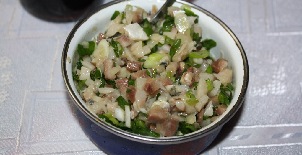 100 гр отцеженной консервированной печени трески или минтая, 1 отварное яйцо, по 1 столовой ложке отварной рассыпчатой каши из риса, мелкорубленой зелени укропа и растительного масла, 30 гр репчатого лука, 1 чайная ложка коньяка.