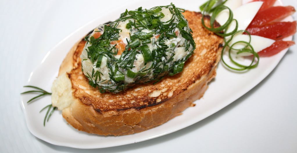 По 200 гр подсушенных в духовке ломтиков хлеба и копченой лососины, 100 гр сливочного масла, 50 гр пряной зелени по вкусу, 1 чайная ложка сока лимона, 1 столовая ложка майонеза.