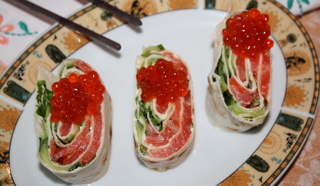 Ролы из лаваша, красной рыбы и огурца