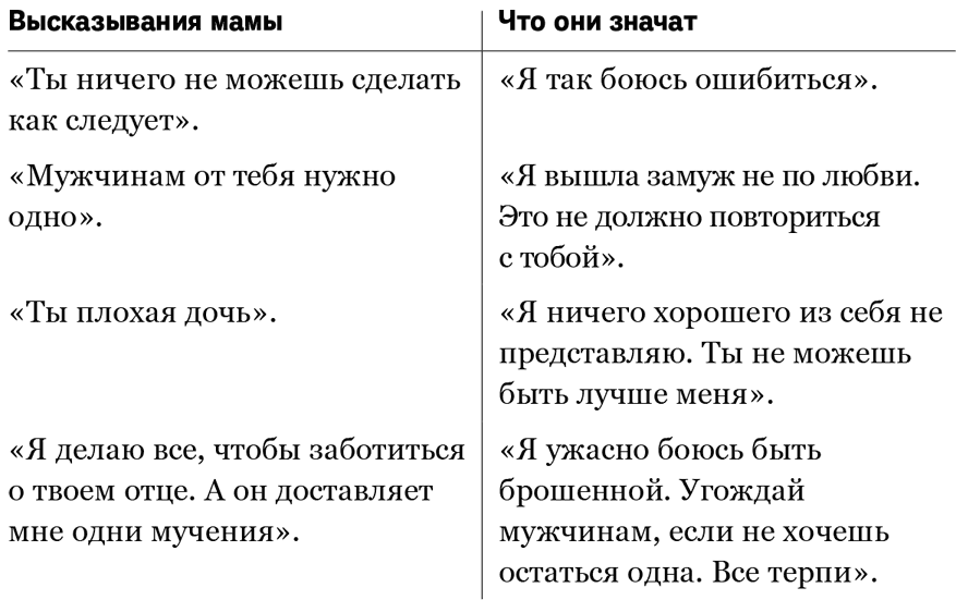 Пытайтесь улавливать скрытый смысл маминых высказываний. Вот универсальный ключ к пониманию: все плохое, что было сказано в адрес дочери, продиктовано плохим отношением мамы к самой себе. Хочешь знать, как человек относится к себе, слушай, что он говорит о других.