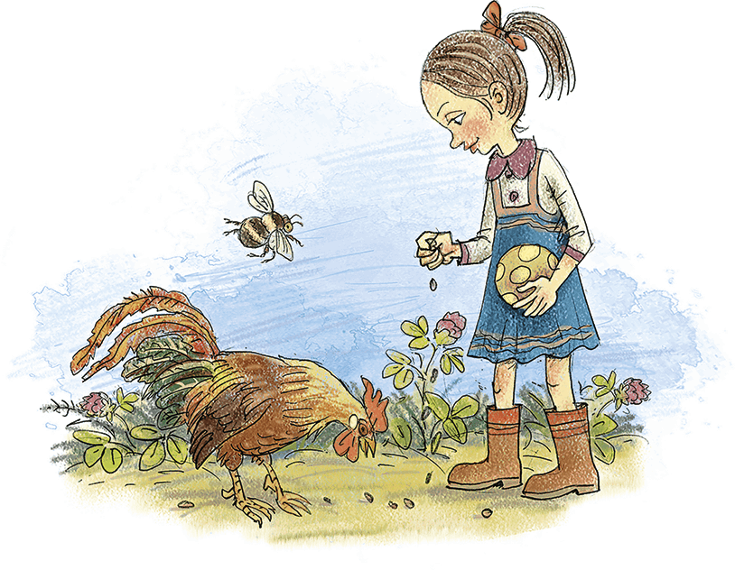 Подбежит к девочке, поклюёт у неё из рук крошки, сядет с ней рядом на завалинке. Пёрышки разноцветные словно маслом смазаны, гребешок на солнышке золотом отливает. Хороший был петушок!