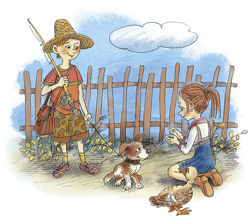 Вот однажды вышли они все во двор и уселись на скамейку: мальчик Ваня, девочка Таня, пёс Барбос, утка Устинья и цыплёнок Боська.