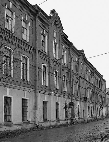 Окна многих из них были затянуты решетками. Здесь были Арестный дом, пересыльная тюрьма, тюремная больница… Одно из этих тюремных зданий, волей судьбы оставшееся по ту сторону институтской стены (в тупичке, которым заканчивается сейчас Миргородская улица), и по сей день используется по назначению. А прямо напротив, за стеной, виден верхний, третий, этаж длинного дома в “кирпичном стиле”. Об этом доме – когда-то № 1 по Глинской улице – и пойдет сейчас речь.
