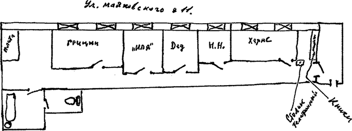 Схема квартиры Ювачевых (Надеждинская ул., д. 11, кв. 8). Справа налево от входа: комнаты Д. Хармса, Е. и Н. Дрызловых, И. Ювачева, бывшей экономки Ювачевых Л. Смирницкой, Грицыных. Схема составлена Кириллом Грицыным 28 февраля 2007 г.