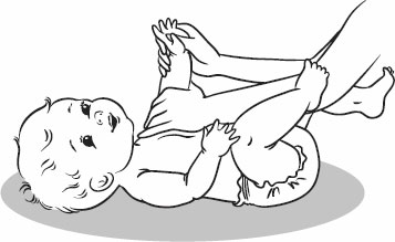Младенец должен лежать на спинке. На ладонь своей левой руки маме надо положить правую ножку ребенка. Своей правой рукой мама должна произвести поглаживание наружной и задней части голени и бедра младенца в направлении от стопы к бедру.