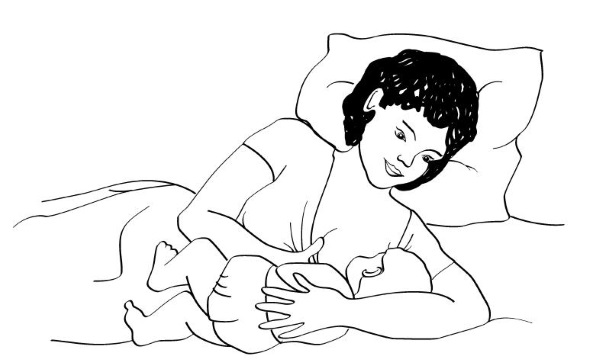 Ребенок лежит на подушке (или на нескольких так, что его голова – выше тела), расположенной сбоку от мамы, ножки уходят назад, животик у маминого бока, а головка у ее груди. Мама обхватывает ребенка той рукой, с какой стороны он лежит, и поддерживает его головку. Так и получается, что малыш находится под рукой (рис. 1).