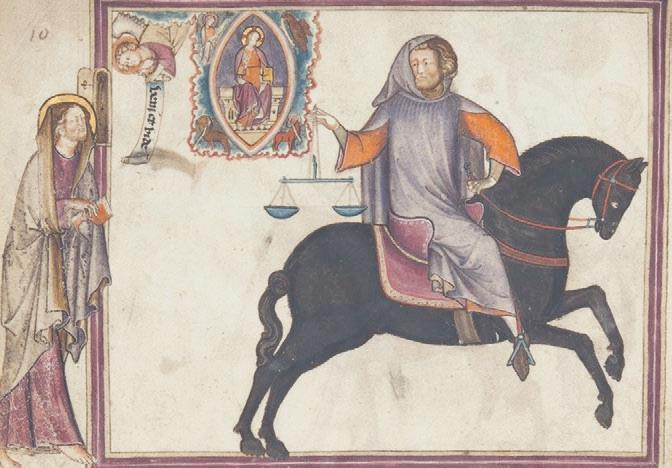 Рис. 9. Иоанн созерцает всадника на вороном (чёрном) коне с мерой-весами в руке. Франция, конец XIII в. Paris. Bibliothèque nationale de France. Lat. 14410, fol. 13v.