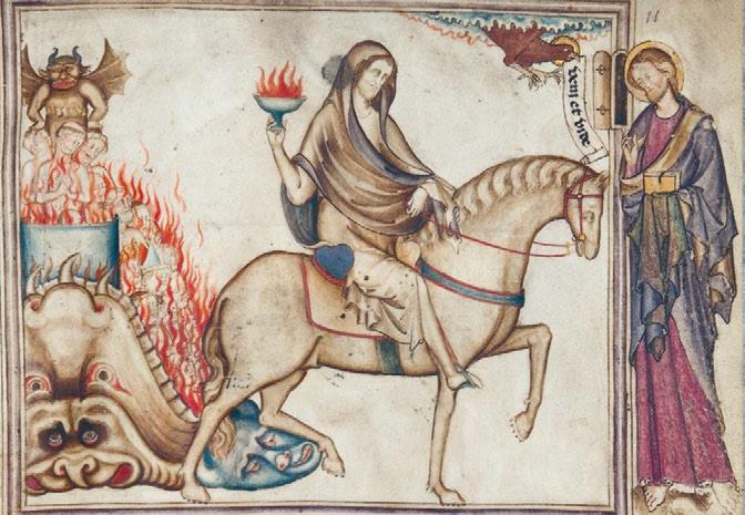Рис. 10. Всадник на бледном коне по имени Смерть несет в своей руке чашу с адским пламенем. Позади него – разверзшаяся пасть ада, куда чёрт запихивает грешников. Франция, конец XIII в. Paris. Bibliothèque nationale de France. Lat. 14410, fol. 11r.