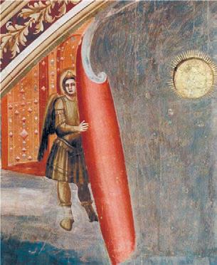 Рис. 13. На фреске знаменитой капеллы Скровеньи Джотто изобразил ангела, сворачивающего небо будто свиток (Откр. 6:14). Джотто, фрагмент из Страшного суда, начало XIV в., Италия, Падуя.