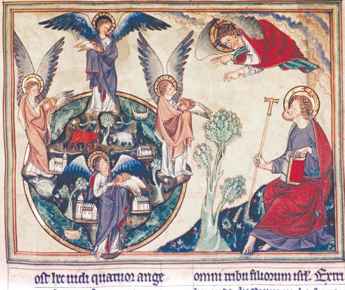 Рис. 14. Четыре ангела держат ветра, изображённые в виде крылатых масок (Откр. 7:1–3). Oxford. Bodleian Library. Douce 180, fol. 19.
