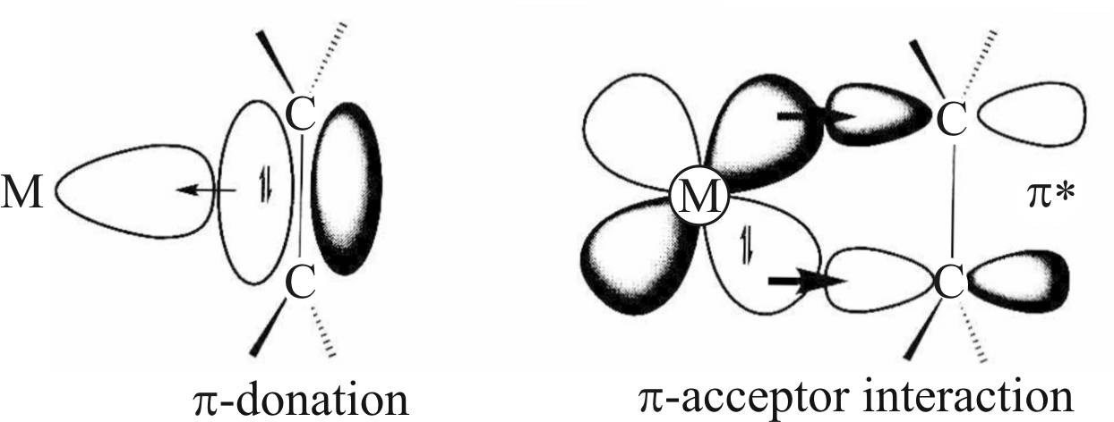 При переносе электронной плотности с π-орбитали этилена происходит накопление положительного заряда в молекуле, что ограничивает перенос электронов, в то же время обратный перенос с занятых орбиталей металла нейтрализует этот заряд, и позволяет продолжить формирование более прочной донорно-акцепторной связи.