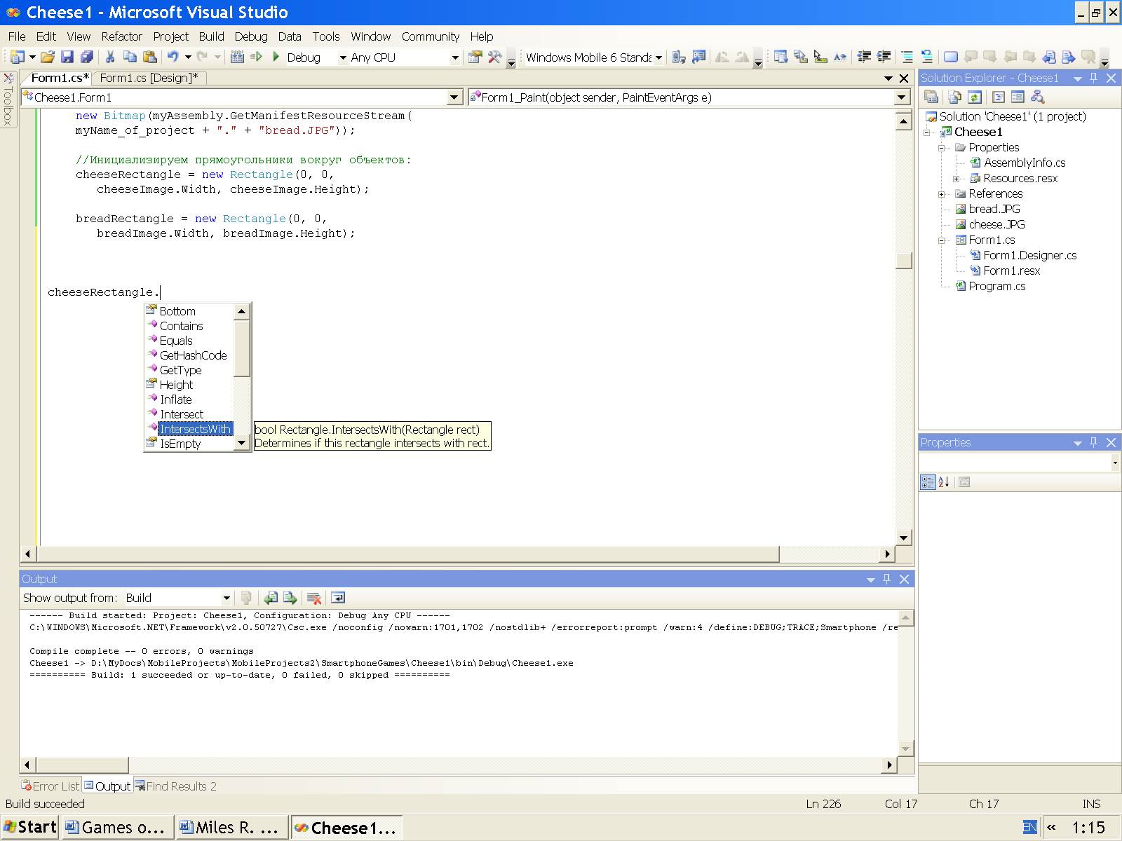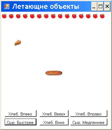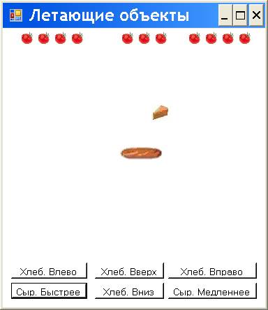 В режиме выполнения (Build, Build Selection; Debug, Start Without Debugging) при помощи кнопок Button и мыши мы можем перемещать хлеб и этим хлебом, как ракеткой, отбивать сыр вверх не только верхней стороной прямоугольника (описанного вокруг объекта), как было в предыдущем коде, но теперь и боковыми сторонами этого прямоугольника. Однако мы можем отбивать, только если сыр перемещается сверху вниз.
