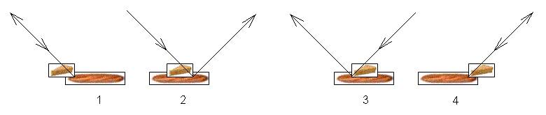 В схемах 1 и 4 маленький прямоугольник ударяется о большой прямоугольник сбоку под углом 45 градусов и отражается под этим же углом и по этой же линии. В схемах 2 и 3 маленький прямоугольник падает на большой прямоугольник под углом 45 градусов, но отражается не по линии падения, а по линии отражения, перпендикулярной линии падения.