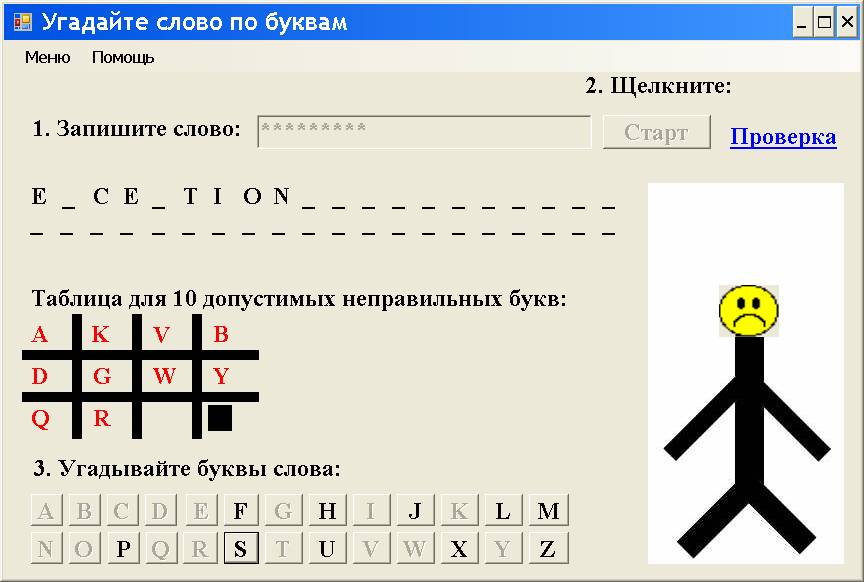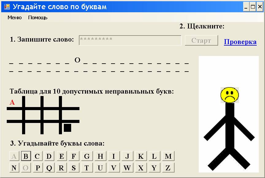 Игрок, угадывающий слово, будет воздействовать на кнопки типа Button с названиями букв из алфавита. После каждого щелчка игроком кнопки (мышью или клавишей Enter) искусственный интеллект анализирует событие, какую букву выбрал игрок, и выдаёт или мелодию для неправильного ответа, или мелодию для правильного ответа. Кроме того, при неправильном ответе искусственный интеллект будет выводить на форму смайлик (в виде известного графического файла) с недовольным изображением лица, а при правильном ответе – с довольным и улыбающимся изображением лица.