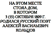 Замечательный русский поэт Алексей Васильевич Кольцов прожил всю свою короткую жизнь в Воронеже. Он родился 3 сентября 1809 года. Усадьба Кольцовых находилась в окраинной городской слободе Гусиновке. Слобода располагалась в узкой долине между двух высоких прибрежных холмов, на одном из которых в своё время построена была крепость Воронеж. Главной магистралью Гусиновки была сбегающая вниз к самой реке Большая Стрелецкая улица. Название своё улица сохранила и до наших дней, хотя были времена, когда её и по-другому называли. На этой улице в нижней, равнинной её части, и стоял дом, в котором появился на свет будущий поэт.