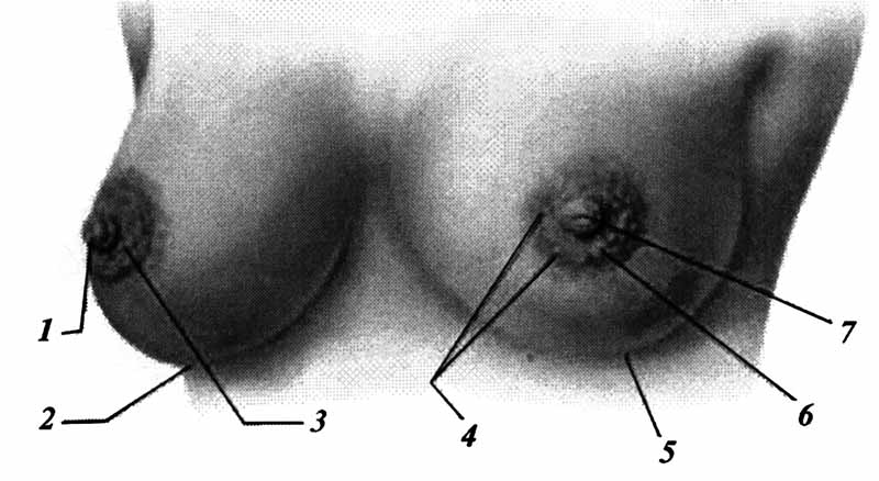 Рис. 2. Передний вид молочных желез: 1 – сосок, 2 – складка молочной железы, 3 – околососковый кружок, 4 – бугорки Монтгомери, 5 – складка молочной железы, 6 – околососковый кружок, 7 – сосок