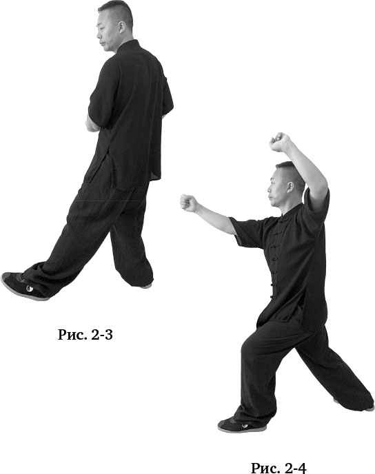 Перенести вес на левую ногу, ещё повернуть корпус немного вправо, окончательное направление на восток, правую ногу приставить рядом с левой на носок, одновременно сжать руки в кулаки и сделать люй влево (рис. 2–5, 2–6).