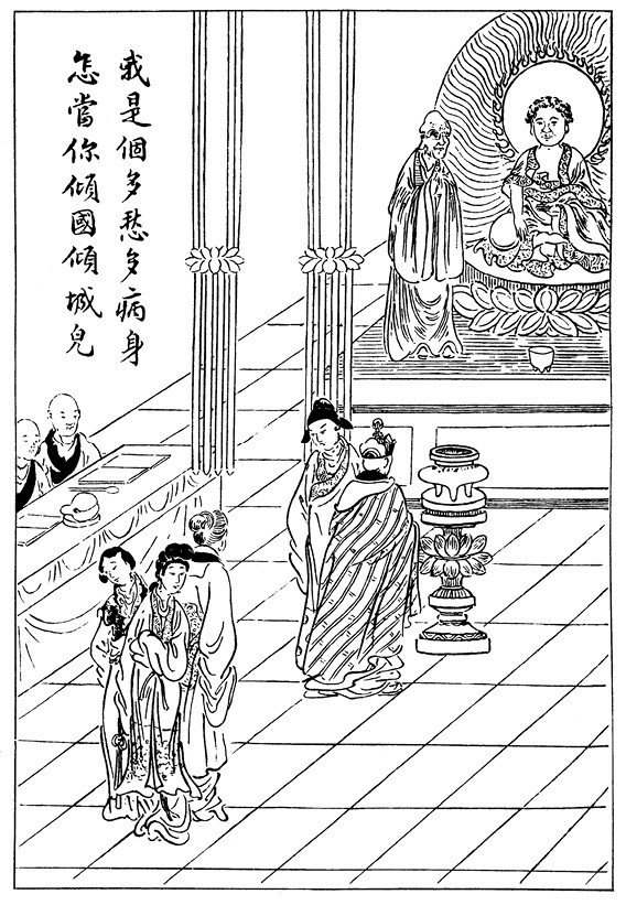 Уста у нее как спелые вишни алеют, А носик припудренный розовой яшмы нежнее. Как груши цветок, лицом и бела и нежна, И станом она, как ива, легка и стройна. Изящна, чиста, Лицо озаряет пленившая всех красота, Стройна и нежна, И подлинной прелести вся воплощенье она.Настоятель (говорит). Разрешит ли госпожа ничтожному монаху сказать несколько слов? У меня есть скромный родственник, сюцай, весь поглощенный учением. После смерти родителей он не имел возможности их отблагодарить. «Разрешите мне внести в поминки свою долю, – попросил он меня, – я хочу поклониться отцу и матери». Я сразу же согласился, но боюсь, что вы, сударыня, сочтете это провинностью.