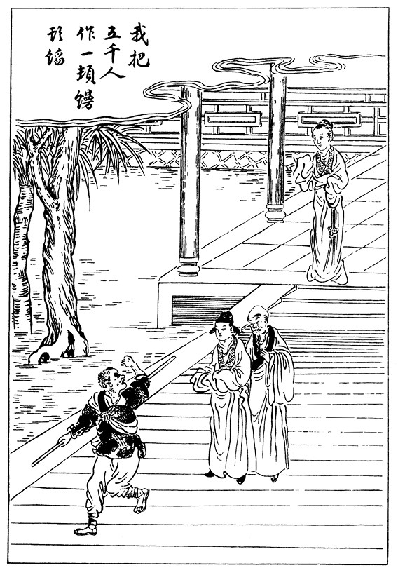 Генерал (говорит). Господин Чжан придумал средство отогнать разбойников, и ваш долг, сударыня, устроить теперь свадьбу. Если вы только не нарушите своего слова, то, как говорится, чистая дева выйдет за благородного мужа.