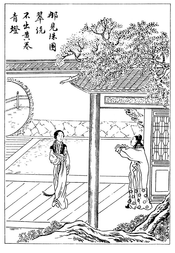 В этом месте укромном, где нога человека ступала едва ли,Мох покрыв бирюзовый, прозрачные капли росы заблистали.Я стою за окном — кашля звуки послышались вдруг.Хун-нян стучится в дверь.