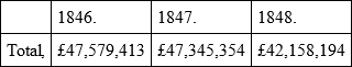 Looking at these tables, we fairly confess that we can see no ground for exultation whatever; on the contrary, there is in every article a marked and steady decline. Some of the free-trade journals assert that, although in the earlier part of the last year there certainly was a marked falling off in our exports, yet that the later months have almost redeemed the deficiency. That statement is utterly false and unfounded. In September last, we showed that the exports of the first seven commodities in the above table, exhibited a decline of £3,177,370, for the six earlier months of the year, as compared with the exports in 1847. We continue the account of the same commodities for eleven months, and we find the deficiency rated at £3,370,603; so that we still have been going down hill, only not quite at so precipitate a rate as before. Free-trade, therefore – for which we sacrificed our revenue, submitted to an income-tax, and ruined our West India colonies – has utterly failed to stimulate our exports, the end which it deliberately proposed.