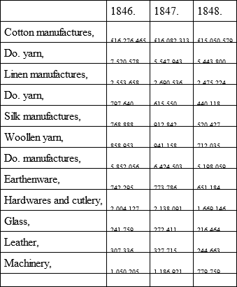 Let us try distinctly to ascertain the real amount of improvement visible in the manufacturing districts. In order to do this, we must turn to the last official tables, which bring down the trade accounts from 5th January to 5th December 1848, being a period of eleven months. We find the following ominous result in the comparison with the same period in former years: —