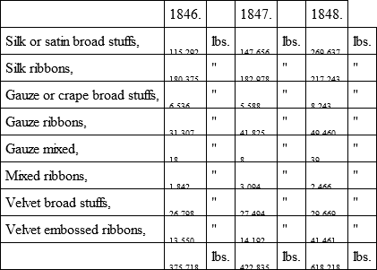 The labour market in this country, so far from improving, is, we have every reason to believe, in a pitiable state. Let us take the one instance of silk manufactures. Of these we exported, during eleven months of last year, an amount to the value of £912,842; this year we have only sent out £520,427, or nearly £400,000 less. But this decline does not by any means express the amount of the curtailment of labour in this important branch of industry. The home market has been inundated with foreign silks, introduced under the tariffs of 1846, and that to a degree which is wholly without precedent. Let us see the comparative amount of importations.