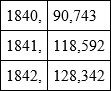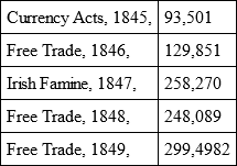 The Railway Mania and artificial excitement of 1843 and 1844 brought down these numbers to one half– they were 57,212 and 70,686 in these two years successively. But the Currency Laws of 1844 and 1845, and Free Trade of 1846, soon more than quadrupled these numbers; and they have never since receded, but, on the contrary, rapidly increased ever since. The numbers were: —