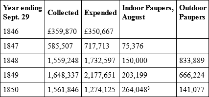 "The collection in the year 1847-8 is remarkable: three times the amount of the collections of 1846-7, five times the amount of the collections of 1845-6. A tax unknown in Ireland ten years before was levied in the Year 1848 to the extent of one-ninth of the rateable property of the country, and that in a period of unprecedented depression and embarrassment. In the same year the expenditure had risen 150 per cent above that of 1847, and 500 per cent above the expenditure of 1846. The expenditure in 1848-9 exceeds that of 1847 by the large sum of £445,054."9