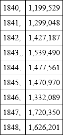 From the table given below, it appears that while, in the year 1826, immediately following the dreadful monetary crisis of December 1825, – by far the severest which had then been felt – the total emigration from the British Islands was under twenty-one thousand; in the year 1849, being the fourth year of Free Trade, and in its last six months one of great commercial activity, it had reached the enormous and unprecedented amount of THREE HUNDRED THOUSAND! In twenty-five years of almost ceaseless Liberal government, and carrying out the principles, social and political, of the Political Economists, the number of persons driven into exile had increased fifteen-fold. So extraordinary and decisive a proof of the progressive increase of suffering in a people is perhaps not to be found in the whole annals of mankind. The emigration-returns for 1850 have not yet been made up, but that they will exhibit a result not less striking and woful than the preceding years may be judged of by the facts, that the emigration from Liverpool, which in 1849 was 154,400, had risen in 1850 to 174,260; and that the emigrants who landed at New York alone, in 1850, were 212,796 – of whom 116,552 were Irish, and 28,125 English subjects, the remainder being chiefly Scotch and Germans.3