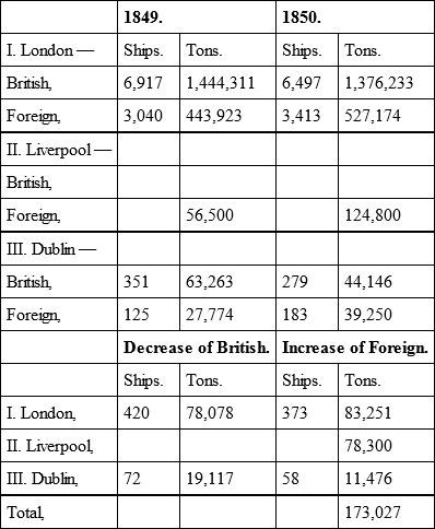 The following Returns from three seaports alone – London, Liverpool, and Dublin – in 1849 and 1850, will show how rapidly this ruinous process is going on: —