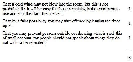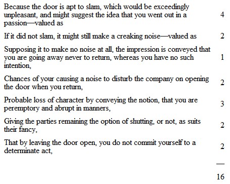 Given that there is a door which may or may not be shut on quitting an apartment, let it be shewn by the rules of arithmetic whether it would be preferable to shut the said door or leave it open. Write down, first, the arguments for not shutting, according to their supposed value; then do the same for the arguments per contra; lastly, sum up both, and strike the balance. Thus—