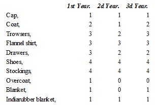 An infantry soldier is allowed the following principal articles of clothing during a three years' term of service: