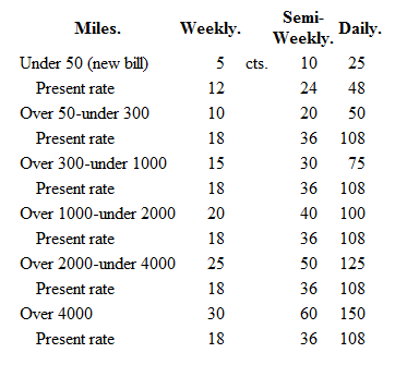 A bill was also passed reducing the rates of postage on letters and newspapers throughout the United States. All letters weighing not more than half-an-ounce are charged three cents if prepaid; five cents if not prepaid, for all distances under three thousand miles; – over three thousand miles, they pay twice these rates. Upon newspapers the imposition of postage is quite complicated. The following statement shows the rates charged to regular subscribers, who pay postage quarterly in advance, comparing, also, the new postage with the old: