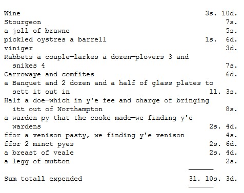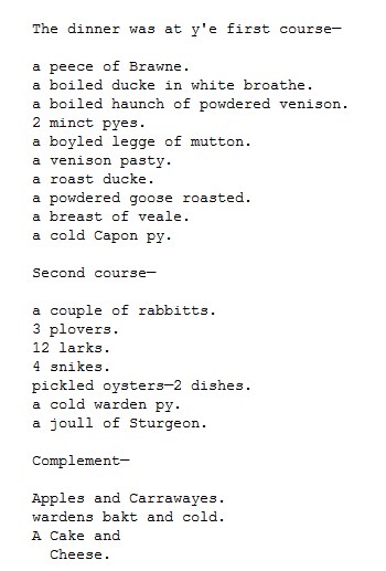 Mem'd—we had out of y'e country y'e goose, y'e duckes, y'e capon py, y'e Cake and wardens, and y'e venison; but that is allways p'd for, though given."