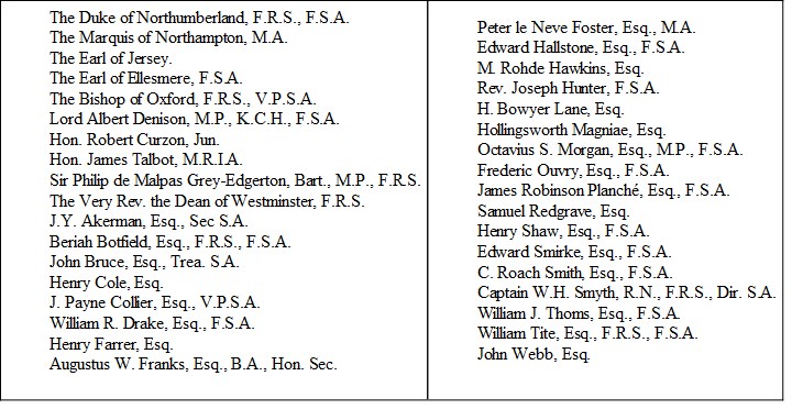 PRESIDENT AND CHAIRMAN,H.R.H. PRINCE ALBERT, K.G., F.R.S., F.S.AVICE-PRESIDENTSTHE EARL OF ENNISKILLENRIGHT HON. SIDNEY HERBERT, M.PSIR JOHN P. BOILEAU, Bart., F.R.SHENRY THOMAS HOPE, Esq. M.P