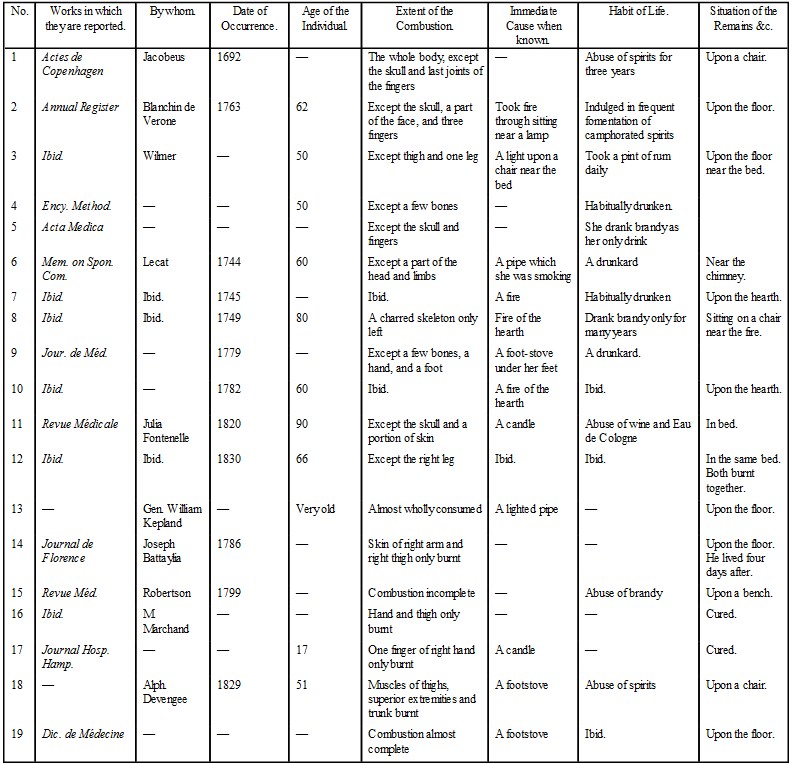 (Vol. vii., p. 286.)Leaving the philosophy of this question for the savans, I beg to add the following to the alleged cases already referred to. Dr. Lindsley has compiled a table of nineteen instances, from the Dictionnaire de Médecine,—not, however, of spontaneous combustion exactly, but of something akin to it; namely, the rapid ignition of the human body (which per se is not combustible) by contact with flame, as a consequence of the saturation of its tissues by alcohol:
