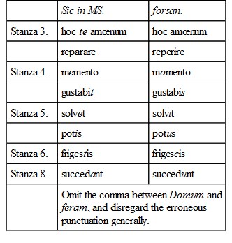 There may be other errors; for, as it stands at present, the song is inferior to the other known productions of the pleasant author of the Itinerarium. We can only hope that its publication, in even this imperfect form, may lead to the discovery of a better text; and we must be content if the lines of the author are applied to our blunders: