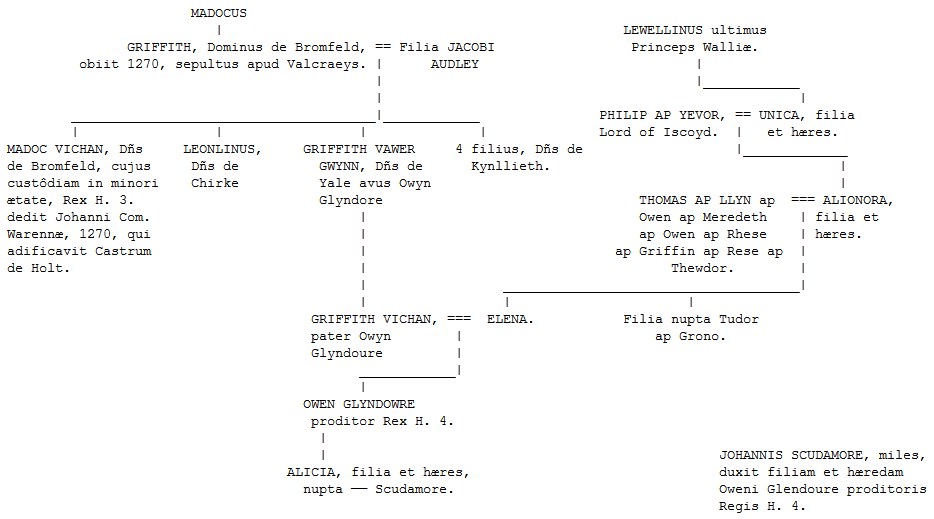 T. C. T.Pedigree of Owen Glendower (Vol. iii., p. 222.).—A contributor who is not a Cambrian, sends the following pedigree of Owen Glyndowr, with the authority from whence he has obtained it, viz. Harl. MS. 807., Robert Glover's Book of Pedigrees and Arms, drawn up in part about 1574.