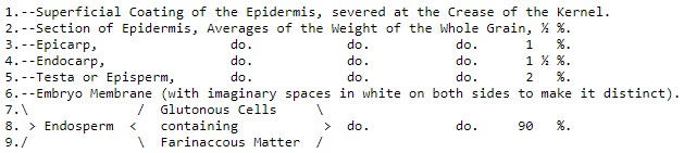 This portion is composed of large glutinous cells, in which the granules of starch are found. The composition of these different layers offers a particular interest; the center, No. 9, is the softest part; it contains the least gluten and the most starch; it is the part which first pulverizes under the stone, and gives, after the first bolting, the fine flour. As this flour is poorest in gluten, it makes a dough with little consistency, and incapable of making an open bread, well raised. The first layer, No. 8, which surrounds the center, produces small white middlings, harder and richer in gluten than the center; it bakes very well, and weighs 20 lb. in 100, and it is these 20 parts in 100 which, when mixed with the 50 parts in the center, form the finest quality flour, used for making white bread.
