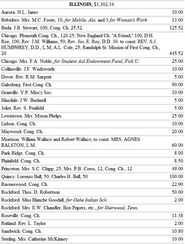 ILL.—Woman's Home Miss. Union, Secretary, Mrs. C.H. Taintor, 151 Washington St., Chicago, Ill.