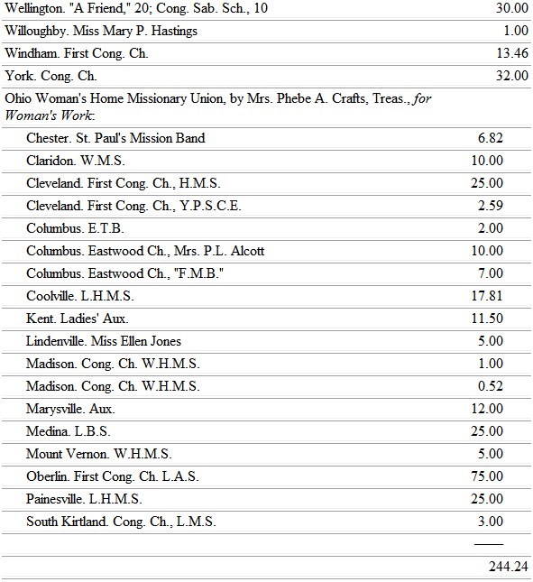 The Ohio Ladies provide for Miss Collins of Dakota, and also for Miss Stevenson of Atlanta, Ga.