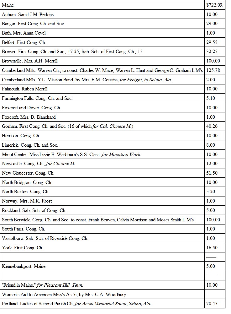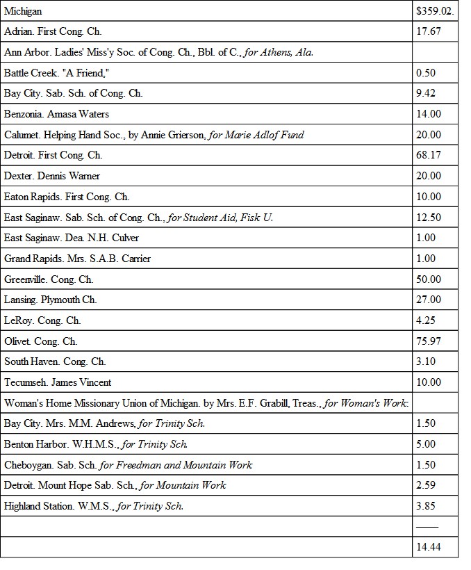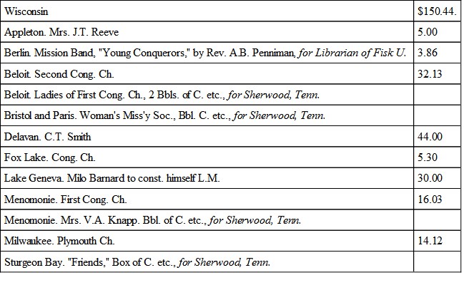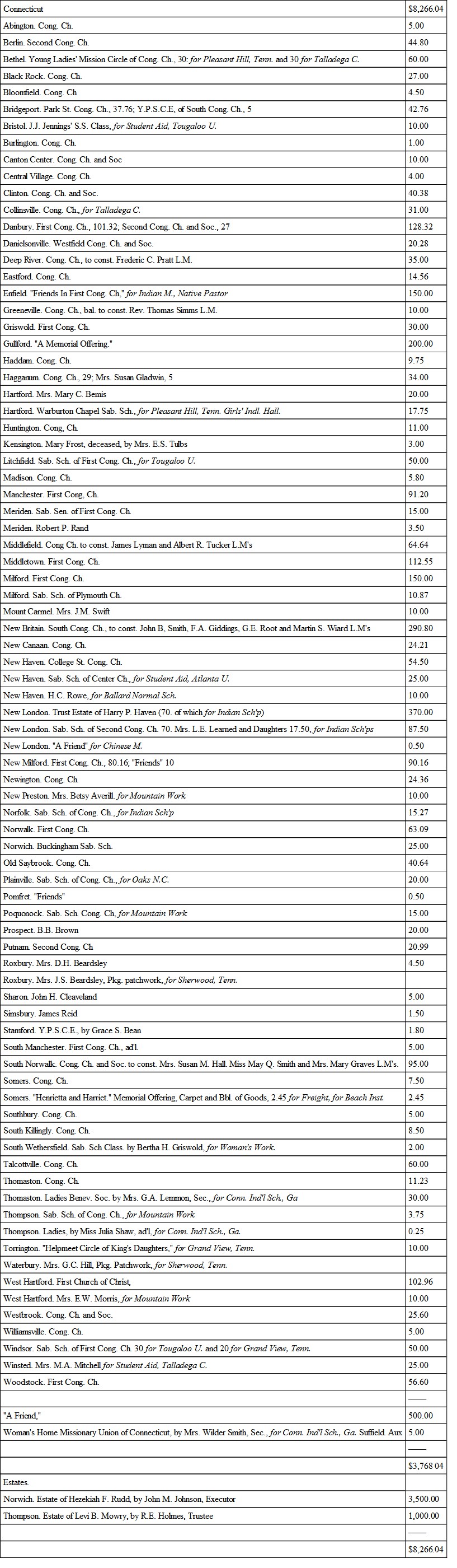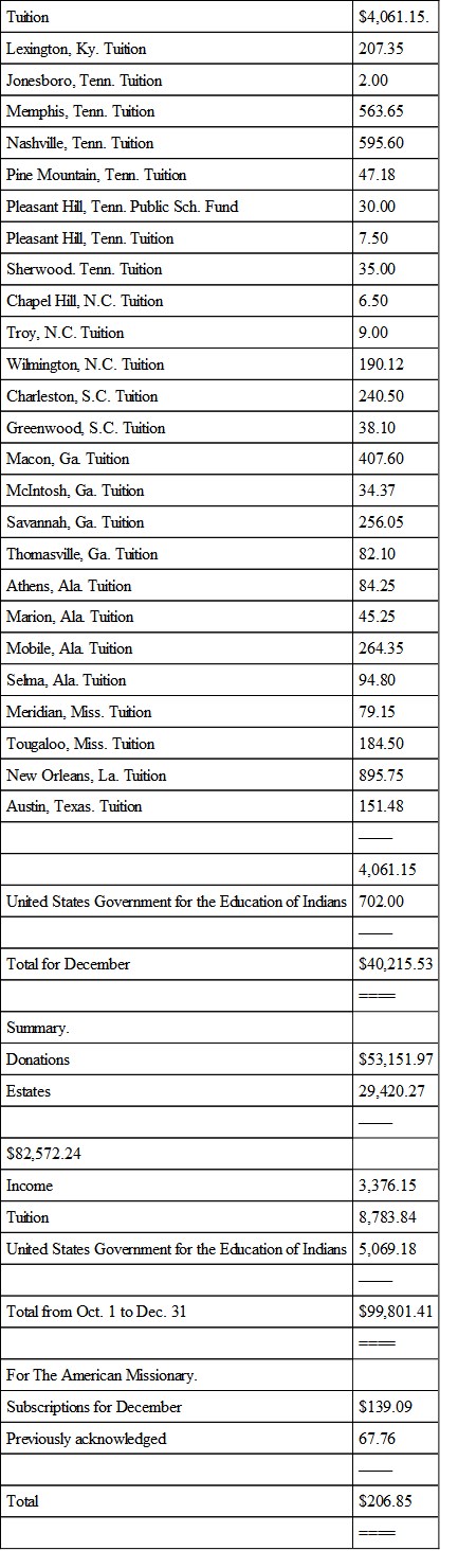 We would suggest to all ladies connected with the auxiliaries of State Missionary Unions, that funds for the American Missionary Association be sent to us through the treasurers of the Union. Care, however, should be taken to designate the money as for the American Missionary Association, since undesignated funds will not reach us.
