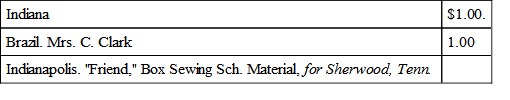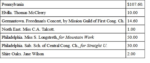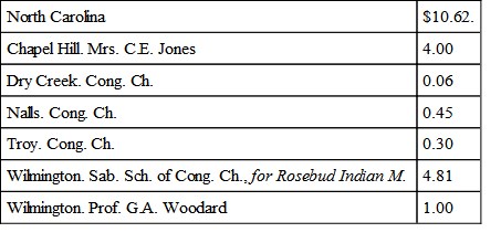 The Way One Mission Band in Iowa raised its money—"Our society was organized in 1888, and the first year we sent twenty dollars for Beach Institute. We have about twenty members, from five to thirteen years of age. We meet once a month through the summer, but close for the winter. Last summer I gave to all over ten years of age a nickel, and those under ten a penny to see how much they could gain. These are a few of the reports. One little boy with his nickel bought a sitting of eggs from which he raised eleven chickens, which he sold for two dollars and twenty cents. Another raised nine chickens which he sold for two dollars. Another bought a little turkey, which he sold at Thanksgiving for a dollar and ten cents. Another with a penny bought a squash vine, from which he sold five large squashes for fifty-five cents. Another bought a row of potatoes for which he received fifty cents, and so the pennies multiplied. I gave mite-boxes to all in the spring, and so at the end of the year we are able again to send you the neat little sum of twenty-five dollars."