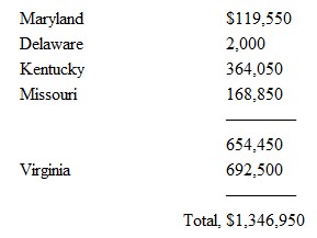 If the Pennsylvania system of liberating immediately only the post nati, so much more liberal than that of most of the free States, were adopted by Maryland, the cost of manumission there would be very small. In the execution of the emancipation act of Congress in this District, infant slaves were valued officially this year by sworn experts at $50 each. Now by the census of 1860, the infant slaves of Maryland, under one year old, surviving on the 1st June, 1860, numbered 2,391, which, at $50 each, would cost $119,550. This would be the actual expense for the first year in Maryland, but decreasing every year, and ceasing altogether in little more than a generation. Now the total number of slaves under one year of age, born in all the slave States, and surviving on the 1st June, 1860, was, by the census, 113,581, which, at $50 each, would cost $5,679,050, for the first year, and decreasing annually as above stated. The post nati numbered in Delaware 40, in Kentucky 7,281, in Missouri 3,377, and in Virginia 13,850, making the first year's cost as follows: